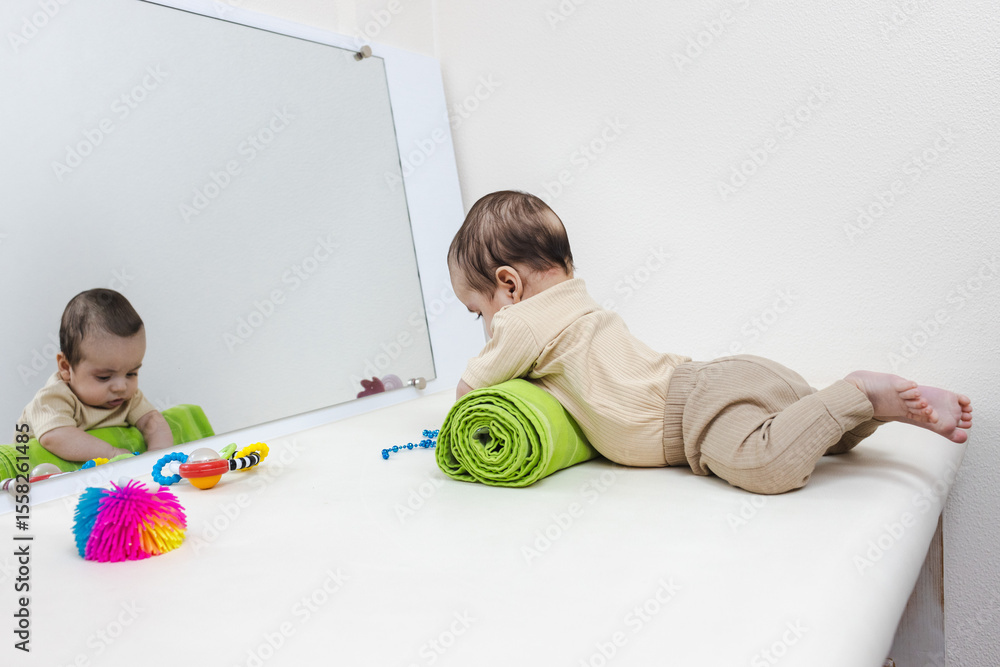 Child rehab exercise on therapy roll under physical therapist supervision. Early movement skills