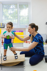 Physiotherapist assisting young child with coordination exercise in rehabilitation center. Neurological rehabilitation for child with therapeutic physiotherapy