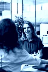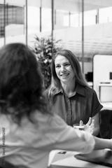 Employer conducting interview with cheerful woman to determine their suitability for company position. Recruiter reviewing happy person resume to determine if necessary qualifications are met