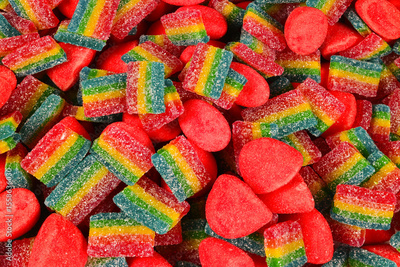 Assorted colorful gummy candies. Top view. Jelly sweets.