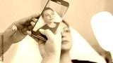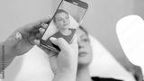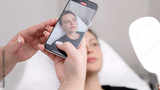 Photo of young woman's lips on smartphone screen. Cosmetologist taking a photo of lips after procedure. Concept of result before and after procedure.