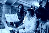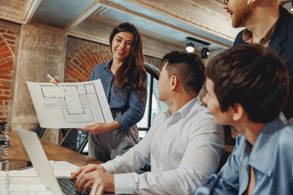 A team discusses architectural plans in a modern workspace, showcasing collaboration and creativity.
