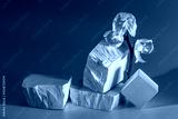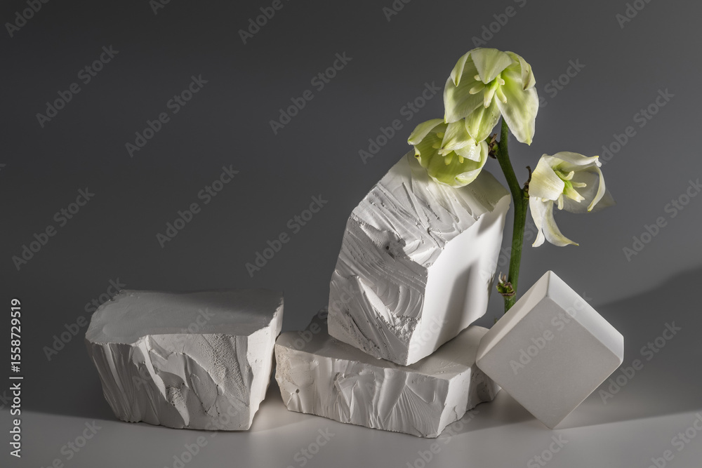 White stones podium, white yucca flowers on gray background with shadows. Minimal empty product presentation demonstration stage.