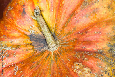 Close up pumpkin tail. Thanksgiving celebration concept. Natural pumpkin orange background.