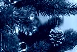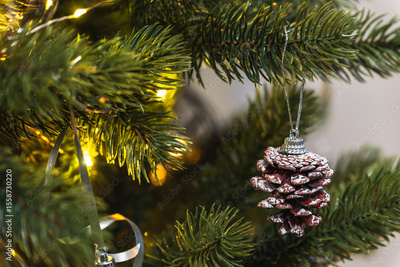 A Christmas tree toy, a pine cone, hangs on a sparkling tree. festive background for New Year or Christmas.