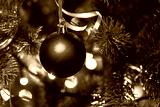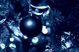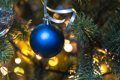 Blue Christmas tree ball hangs on a sparkling tree. festive background for New Year or Christmas.