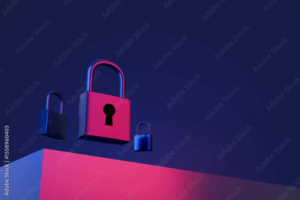 Colorful padlock floating above keyhole with broken key pieces on neon gradient background, symbolizing digital security or data breach