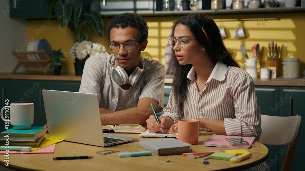 Multiracial woman man studying together at kitchen table high school college students African American guy Latino woman two teenagers use laptop computer online class write homework distant education