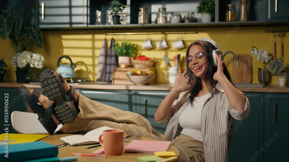 Latina American ethnic woman happy teen girl gen z teenager high school studying female student relaxed choose song with mobile phone at home kitchen listen music in headphones enjoy audio relax dance