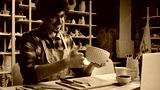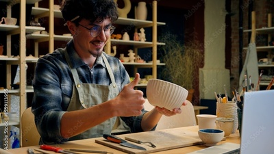 Caucasian guy man student online class pottery workshop male blogger craftsman artist designer potter teacher showing handmade bowl modeling clay teach craft ceramics video call tutorial lesson laptop