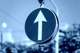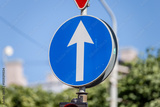 blue circular one way traffic sign with white arrow pointing forward against clear sky and urban background for city navigation, road safety, driving direction and modern transportation signage