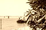 A closeup of pink oleander flowers with the serene waterfront of Adriatic sea in Murano, Italy in the blurred background. Soft focus