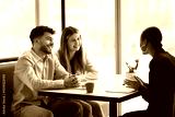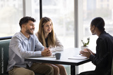 Consultation over coffee. Smiling married couple meeting with female professional tax consultant real estate broker insurer at cafe listen to expert advice with interest planning contract investment