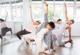 Young man dances hip hop with friends during workout. Young people perform basic important elements in deep squat, as if they are doing push-ups, bending their whole body
