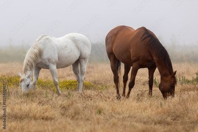 Two Horses Grazing in a foggy field. Half Moon Bay, California, USA.