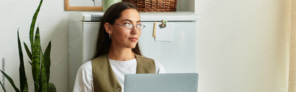 Young woman enjoys cozy moments at home while working on her laptop with natural light