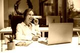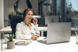 Female professional working on laptop with headset in modern office
