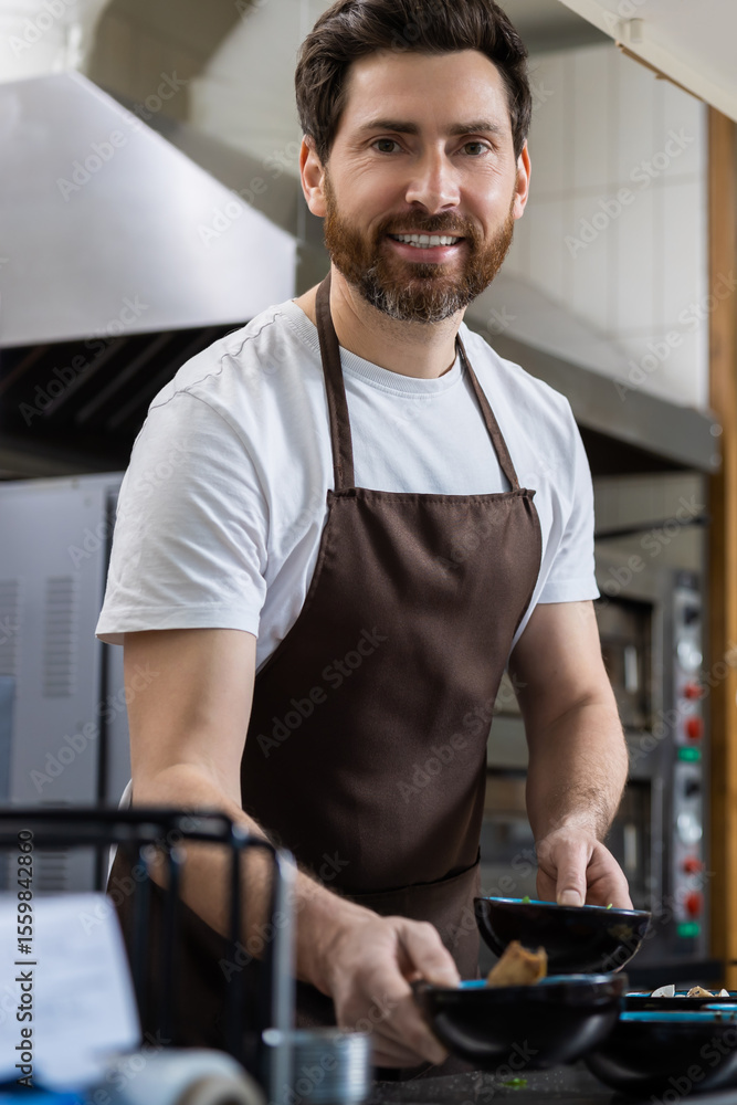 Male baker looking at the camera and smiling, standing near kitchen equipment