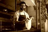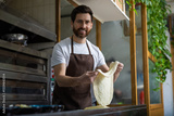 Bearded man wearing white t-shirt, brown apron tossing pizza dough in bakery kitchen