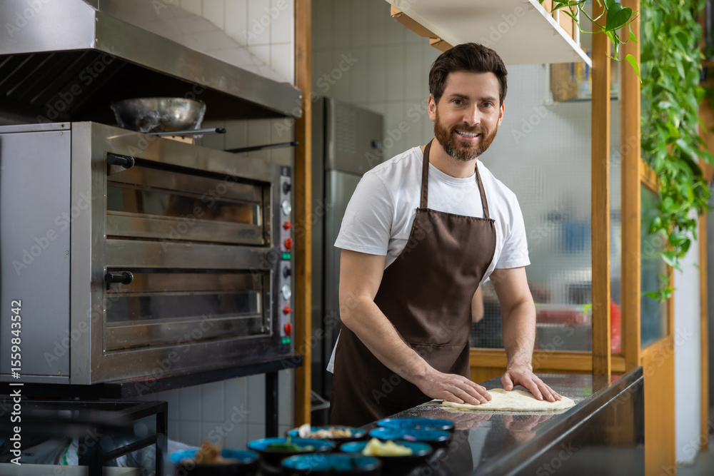 Man with beard in white shirt, dark apron stretching dough for pizza in kitchen