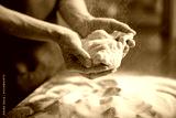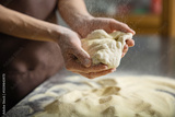 Person kneading dough in kitchen shaping pizza base carefully preparing meal
