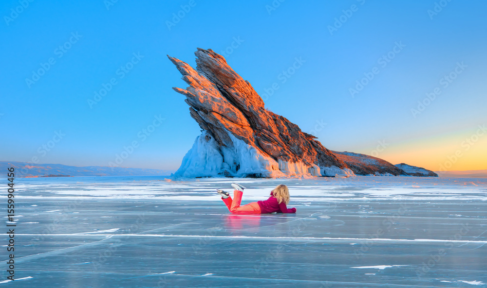 A blonde woman poses lying on ice - Beautiful winter landscape of frozen Lake Baikal at sunrise - A granite rock with steep slopes rises above a frozen lake - Baikal lake, Siberia