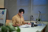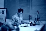 Serious office worker reviewing financial reports late at night