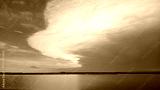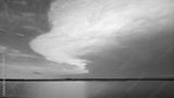 Landscape with unusually shaped white cloud in the evening sky over the lake