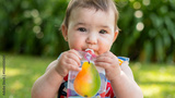 Baby girl enjoying a fruit pouch while looking at the camera. Natural, healthy snacking moment captured outdoors with a focus on childhood curiosity and connection.