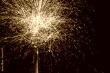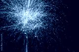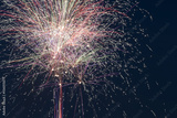 Closeup of colorful fireworks bursting against a deep blue night sky