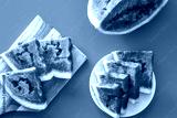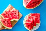 Cut watermelon for break with fruit on blue background top view