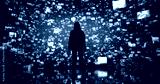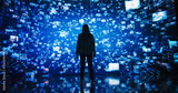 Young Woman Standing Before a Dynamic Digital Screen, Immersed in Internet Visualization. Internet Cyberspace with Web Content, Icons, Animated Stream of Online Applications and Entertainment