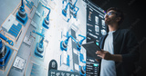 Indian Robotics Specialist Programs a Group of Robotic Arms with the Help of a Tablet Computer. Specialist Creates and Programs the Assembly Line Online, Optimizing Production and Improving Efficiency