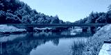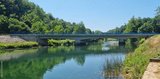 A bridge with a blue railing spans the emerald-green Dobra River, surrounded by lush greenery under a clear blue sky