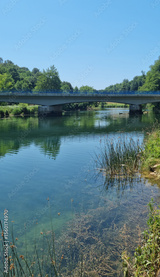 A bridge with a blue railing spans the emerald-green Dobra River, surrounded by lush greenery under a clear blue sky
