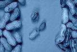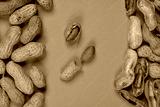 A vertical photograph of peanuts in their shells and a few shelled peanuts, arranged on a vibrant orange background