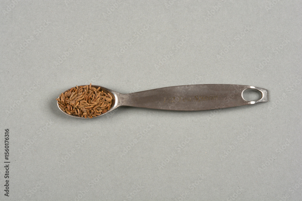 A spoon full of cumin seeds lies horizontally on a simple gray background