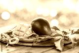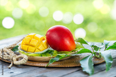 Fresh Red Mango fruit in Bamboo basket on wooden table in garden, Organic Fresh Red Mango with mango cube on blurred greenery background.