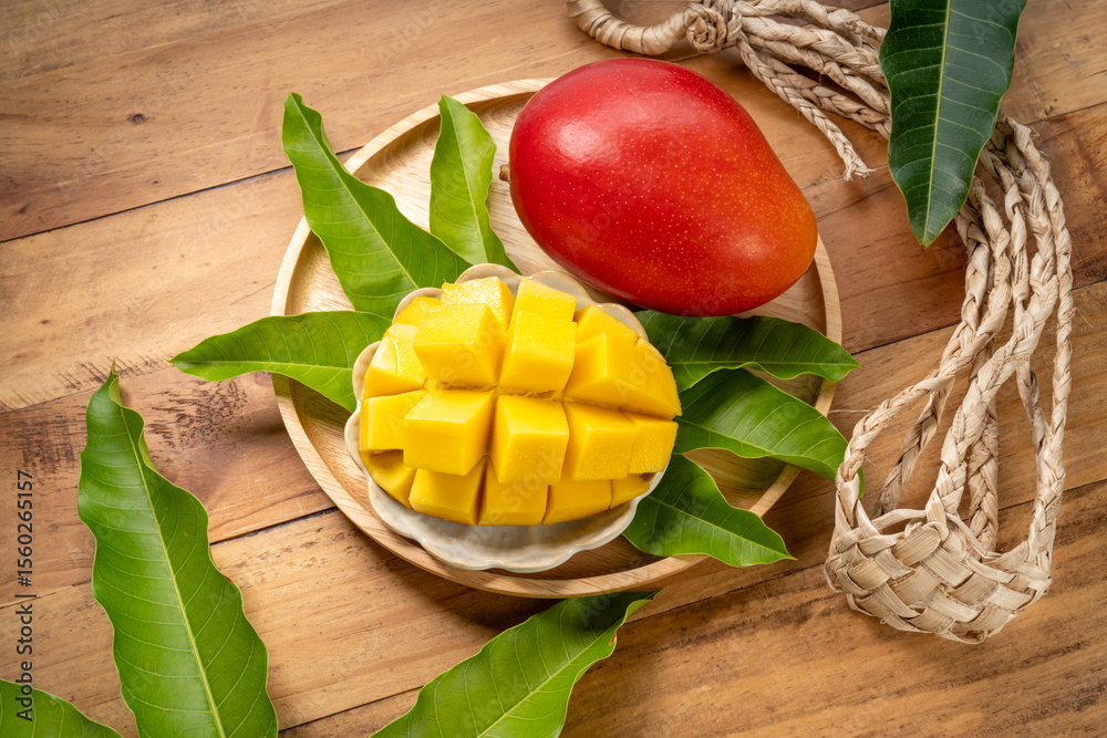 Red Mango fruit in Bamboo basket on wooden table in garden, Fresh Red Mango with mango cube on wooden background.