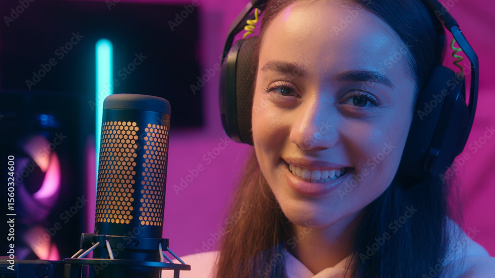 Caucasian woman female girl user gamer streamer radio with microphone stream computer play gaming playing online video game streaming indoor at home evening neon light smiling to camera smile portrait