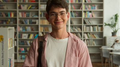 Caucasian concentrated teenager guy looking away thinking holding book smiling look at camera happy in school college library carefree teen boy hold literature education studying learning bookstore