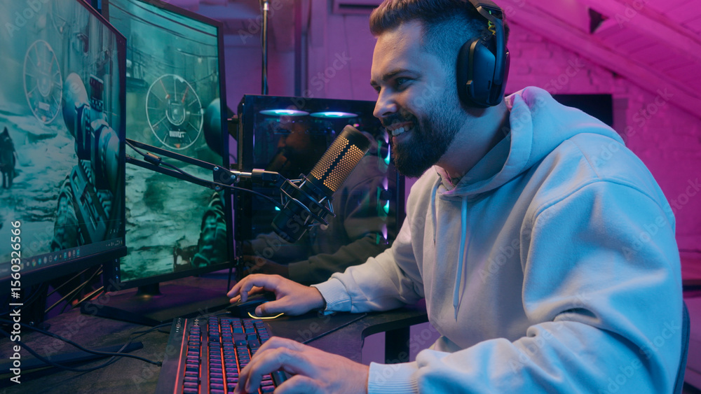 Smiling happy Caucasian addicted male gamer guy man streamer play at computer internet virtual gaming at home web battle online playing video game at dark evening with microphone and headset laughing
