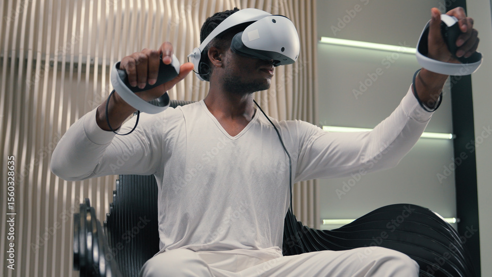 African American cyber man in white futurism studio male guy futuristic wearing vr glasses virtual reality helmet 3d space using innovation modern technology for business gaming education metaverse