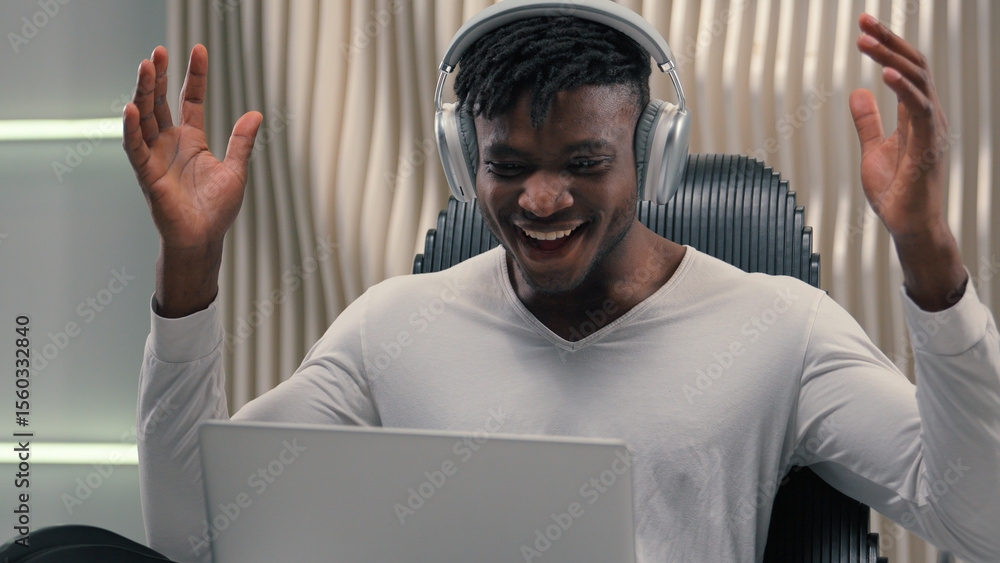 African American ethnic cyber man in white futurism studio indoors business male user gamer hacker businessman guy futuristic in headphones win laptop success achieve computer good news amazed wow