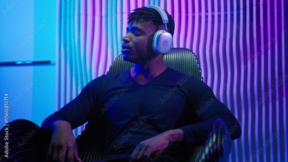 African American man guy male sitting in chair listening music in headphones using wireless earphones listen audio enjoy song sound enjoy modern cyber technology neon futurism room futuristic violet