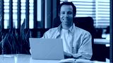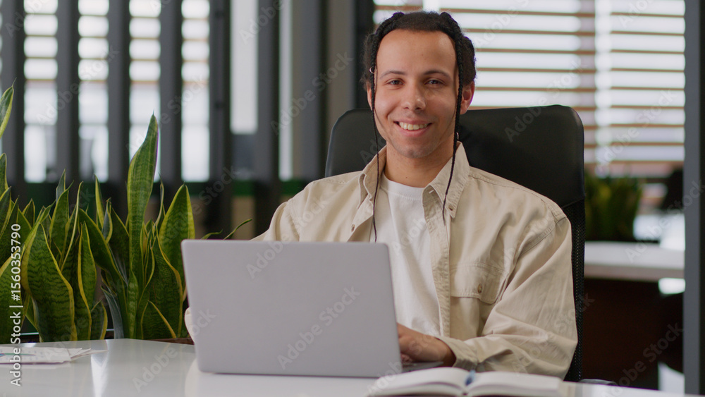 Ethnic hipster Hispanic business man Latina male student studying businessman American guy worker smiling working laptop typing computer online in office education corporate task pc internet chat