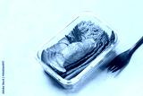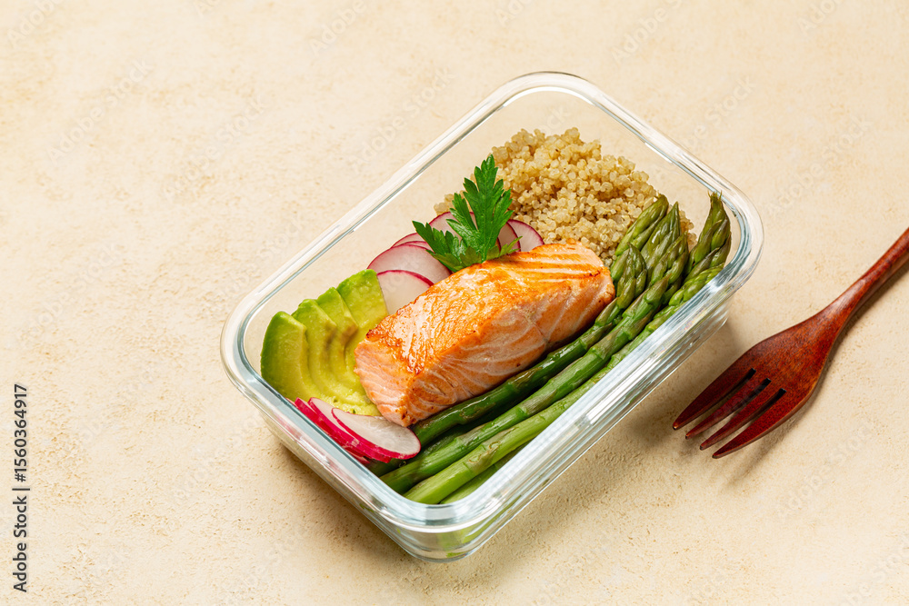 Lunchbox with healthy food, oven baked salmon fish, quinoa, asparagus, redish and avocado. Meal prepping on a beige table, wooden fork.