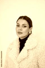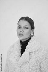 Woman in a fluffy light-colored coat with a black turtleneck underneath, looking forward. Her hair is pulled back, and she has subtle makeup, creating a stylish and sophisticated look