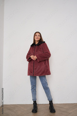 Woman in burgundy coat, blue jeans, and black boots stands casually against a white wall. She smiles and looks to the side with hands clasped. Light wooden floor beneath