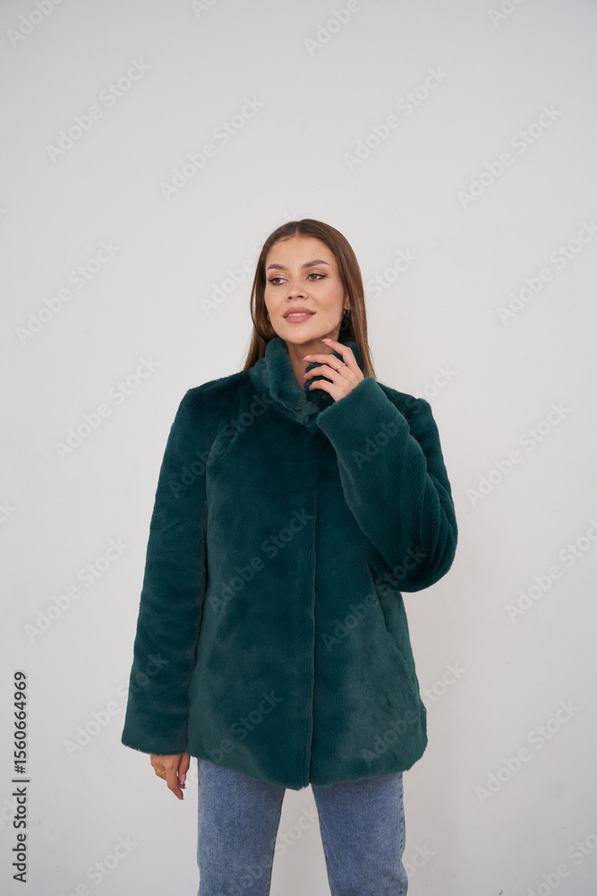 Fashion-forward woman wears a luxurious, dark green faux fur coat with a high collar, paired with light blue jeans. Her expression is serene, with her hand near her face